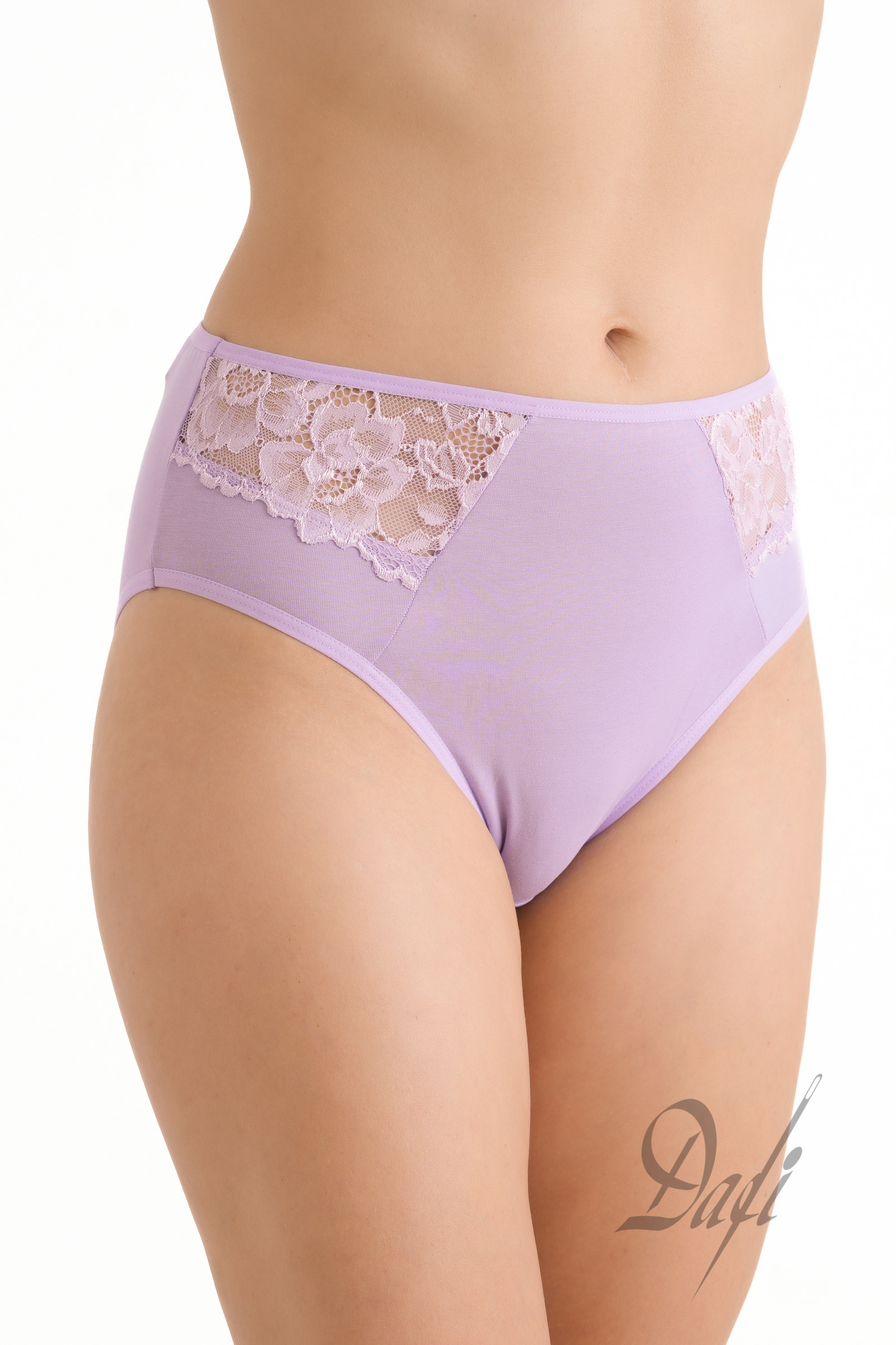 Бикини “ДАФИ” с висока талия и дантелена декорация от фина дантела във флорални мотиви по предната част, отзад бикините са изцяло изчистени. Обточени са с мек и нежен ластик, който им придава комфорт при употреба.