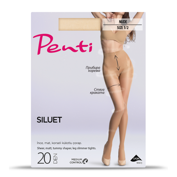 Penti Siluet 20 DEN представлява дамски чорапогащник със стягащ ефект и изчистен цвят, който е подходящ както за ежедневна употреба, така и за специални поводи. Висококачествените материали, от които е изработен позволяват на кожата да диша свободно и не предизвикват запарване. Същевременно благодарение на използваната фина материя придават елегантност, стил и комфорт. Продуктът осигурява стягащ ефект по цялата дължина на крака, прибира корема, повдига дупето и пристяга брича. Разполага с ластична лента в частта на ханша и корема, чрез която да се напаснете индивидуално и да остане фиксиран и изгладен, както сте пожелали. Предлага се в разнообразни телесни и по-тъмни нюанси, за всеки тен и всяка истинска дама. С прелестния еластичен чорапогащник от Penti ще се радвате на изящност и изисканост по всяко време и на всяко място.