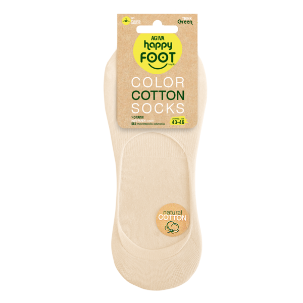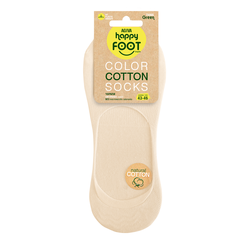 Терлици от органичен бамбук No show Agiva Happy Foottopia в бежов цвят. Стилни и съвместими с всеки гардероб, те са универсален модел, подходящ за спортни или класически обувки. Формата на терлиците позволява те да се скрият под ръба на обувките. Така те остават невидими. Всички модели от серията са без пластмасови закачалки на етикета, с мисъл за теб и природата!