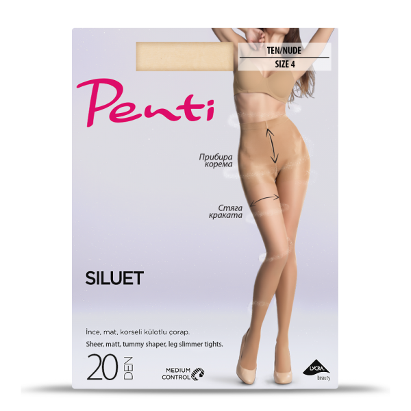 Penti Siluet 20 DEN представлява дамски чорапогащник със стягащ ефект и изчистен цвят, който е подходящ както за ежедневна употреба, така и за специални поводи. Висококачествените материали, от които е изработен позволяват на кожата да диша свободно и не предизвикват запарване. Същевременно благодарение на използваната фина материя придават елегантност, стил и комфорт. Продуктът осигурява стягащ ефект по цялата дължина на крака, прибира корема, повдига дупето и пристяга брича. Разполага с ластична лента в частта на ханша и корема, чрез която да се напаснете индивидуално и да остане фиксиран и изгладен, както сте пожелали. Предлага се в разнообразни телесни и по-тъмни нюанси, за всеки тен и всяка истинска дама. С прелестния еластичен чорапогащник от Penti ще се радвате на изящност и изисканост по всяко време и на всяко място.