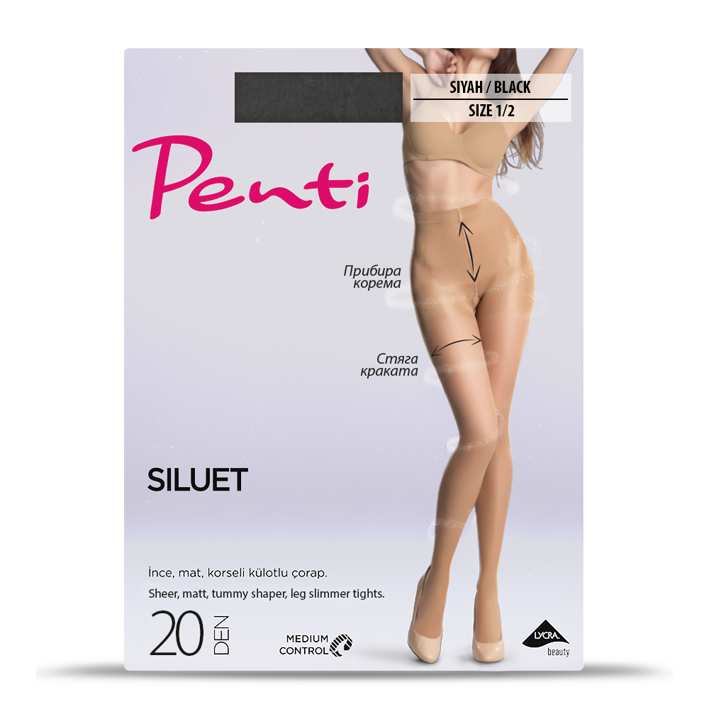 Penti Siluet 20 DEN представлява дамски чорапогащник със стягащ ефект и изчистен цвят, който е подходящ както за ежедневна употреба, така и за специални поводи. Висококачествените материали, от които е изработен позволяват на кожата да диша свободно и не предизвикват запарване. Същевременно благодарение на използваната фина материя придават елегантност, стил и комфорт. Продуктът осигурява стягащ ефект по цялата дължина на крака, прибира корема, повдига дупето и пристяга брича. Разполага с ластична лента в частта на ханша и корема, чрез която да се напаснете индивидуално и да остане фиксиран и изгладен, както сте пожелали. Предлага се в разнообразни телесни и по-тъмни нюанси, за всеки тен и всяка истинска дама. С прелестния еластичен чорапогащник от Penti ще се радвате на изящност и изисканост по всяко време и на всяко място.